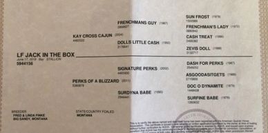 This colt is another good son of Kay Cross Cajun. He is not as flashy as his siblings, but he is pretty good. His mother is a half sister to our stallion Black in Da Cash. She brings Doc O Dynamite and Dash for Perks to the table. Throw in Frenchman’s Guy and you have a pretty good minded and correct, and easy to train. LF JACK IN THE BOX is a little far back in the sale order because of his color but he could be a good prospect for a team roper or a stallion for someone. He will definitely be a great ride.